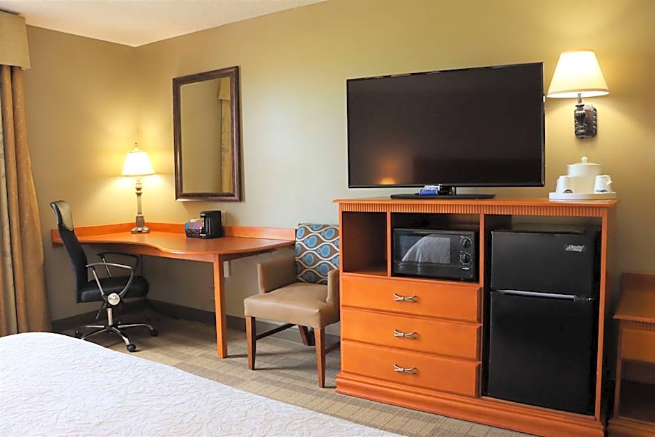 A seating area with a flat-screen TV is featured in this room. A microwave, fridge, and coffee maker are provided.